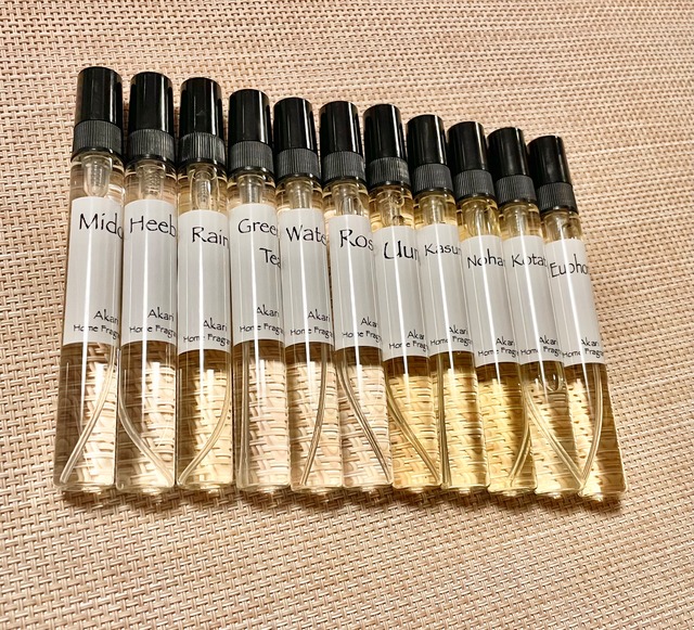 Midori, Heeba, Rain, Green Tea, Water, Rose Uumi, Kasumi, Nohara, Kotatsu, Euphoria, Tapiolaの12種のムエット(香りを吹きつけた用紙)のみになります。 香りの詳細は各商品ページをご覧ください。